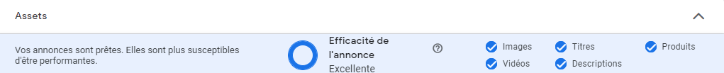 Si vous avez cliqué sur le bouton de bascule depuis vos campagnes Smart Shopping vers Performance Max, il se peut que vous n’ayez pas tous les éléments requis listés ci-avant dans votre campagne.Dans ce cas, Google Ads, dont la bonne pratique est d’inclure tous les éléments, risque d’évaluer faiblement l’efficacité de vos annonces. En conséquence, vous devrez vous positionner sur des enchères plus élevées pour diffuser de manière performante, ce qui impactera votre rentabilité.Pour améliorer l’efficacité de vos annonces, commencez par vérifier les scores globaux de ces dernières :