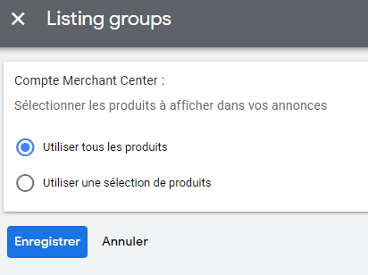 À la différence de l’option précédente, contactez directement votre AM Google dédié au compte et il pourra mettre en exclusion la liste de mots-clés à exclure.Segmentez vos groupes d’éléments par catégorie de produitsSi vous avez un flux produit avec un nombre conséquent de produits, n’hésitez pas à segmenter votre campagne par catégorie de produit.Quand vous paramétrez vos groupes d’éléments dans Performance Max, choisissez “Utiliser une sélection de produits”.