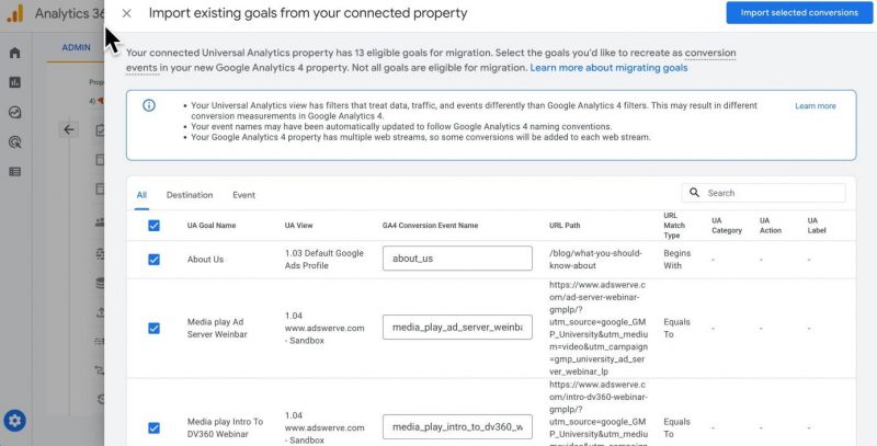 Il faudra noter que l’importation des objectifs ne concernent pas les objectifs que d’une vue Universal Analytics mais de l’ensemble des vues d’une propriété. Cela signifie que si par exemple vous avez des objectifs sur la Vue A et B, alors ils seront tous importables au sein de GA4 (ce dernier n’a pas de système de vue). Vous allez donc devoir effectuer un tri des objectifs dont vous souhaitez effectuer la migration.