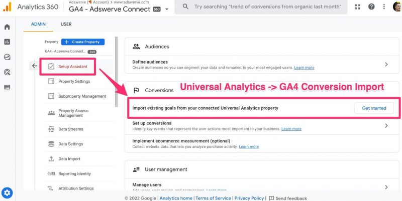 Pour trouver l’outil de migration, vous devez aller dans votre propriété Universal Analytics 3, dans la partie Administration, ensuite cliquer sur « Assistant de configuration GA4 » (ici Setup Assistant). À l’intérieur de la partie « Conversions » vous trouverez l’option pour importer vos objectifs depuis votre propriété Universal Analytics.