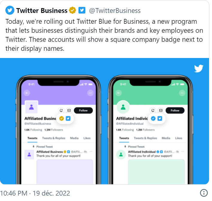 Twitter a annoncé en décembre 2022 la volonté de proposer un abonnement pour les entreprises, originellement nommé Twitter Blue for Business. Concrètement, il s’agit pour une entreprise de pouvoir choisir de lier à son compte une liste illimitée de collaborateurs préalablement choisis. Employés, dirigeants, marques affiliées… auront donc à la fois leur propre badge de certification ainsi qu’un autre représentant la photo de profil du compte de leur entreprise.Par ailleurs, cet abonnement devrait finalement s’appeler Twitter Verification for Organizations. Il permettra ainsi à tous les utilisateurs de Twitter de facilement distinguer une entreprise et ses collaborateurs à travers les badges associés au compte d’un utilisateur.