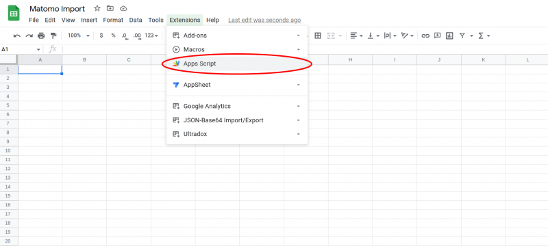 - Dans cette feuille Google Sheets, cliquez sur « Extensions > Apps Script »