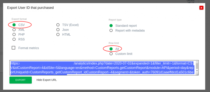 - Choisissez « CSV » sous « Export Format », choisissez « All » sous « Row Limit », cliquez sur « Show Export URL » puis copiez « Export URL » :