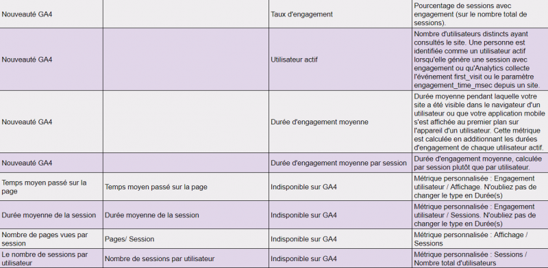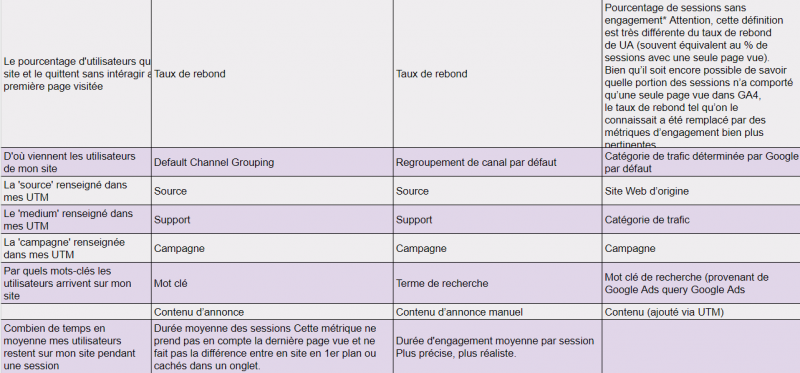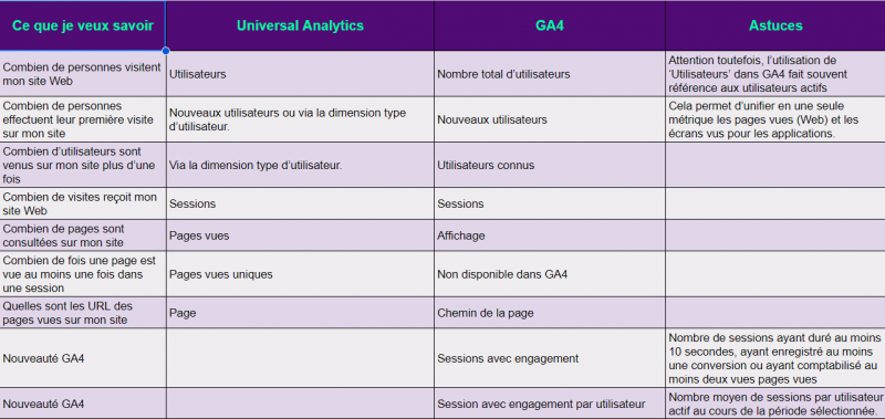 Si vous avez effectué la migration d’UA vers GA4, vous savez qu’il existe un nouveau modèle de suivi des données, ainsi que de nouvelles dimensions et métriques à exploiter. Google continue de fournir l’essentiel des dimensions et des métriques, mais elles portent maintenant des noms légèrement différents. Certaines métriques UA ne sont pas présentes par défaut dans GA4, comme les utilisateurs récurrents, mais elles peuvent être facilement recréées au besoin. De plus, GA4 offre une grande flexibilité pour créer de nouvelles dimensions et métriques spécifiques.Le tableau ci-dessous présente les équivalences entre UA et GA4 pour nos dimensions et statistiques les plus utilisées. Vous remarquerez que pour certaines, elles doivent être créées à l’aide des champs personnalisés, dans Looker Studio.