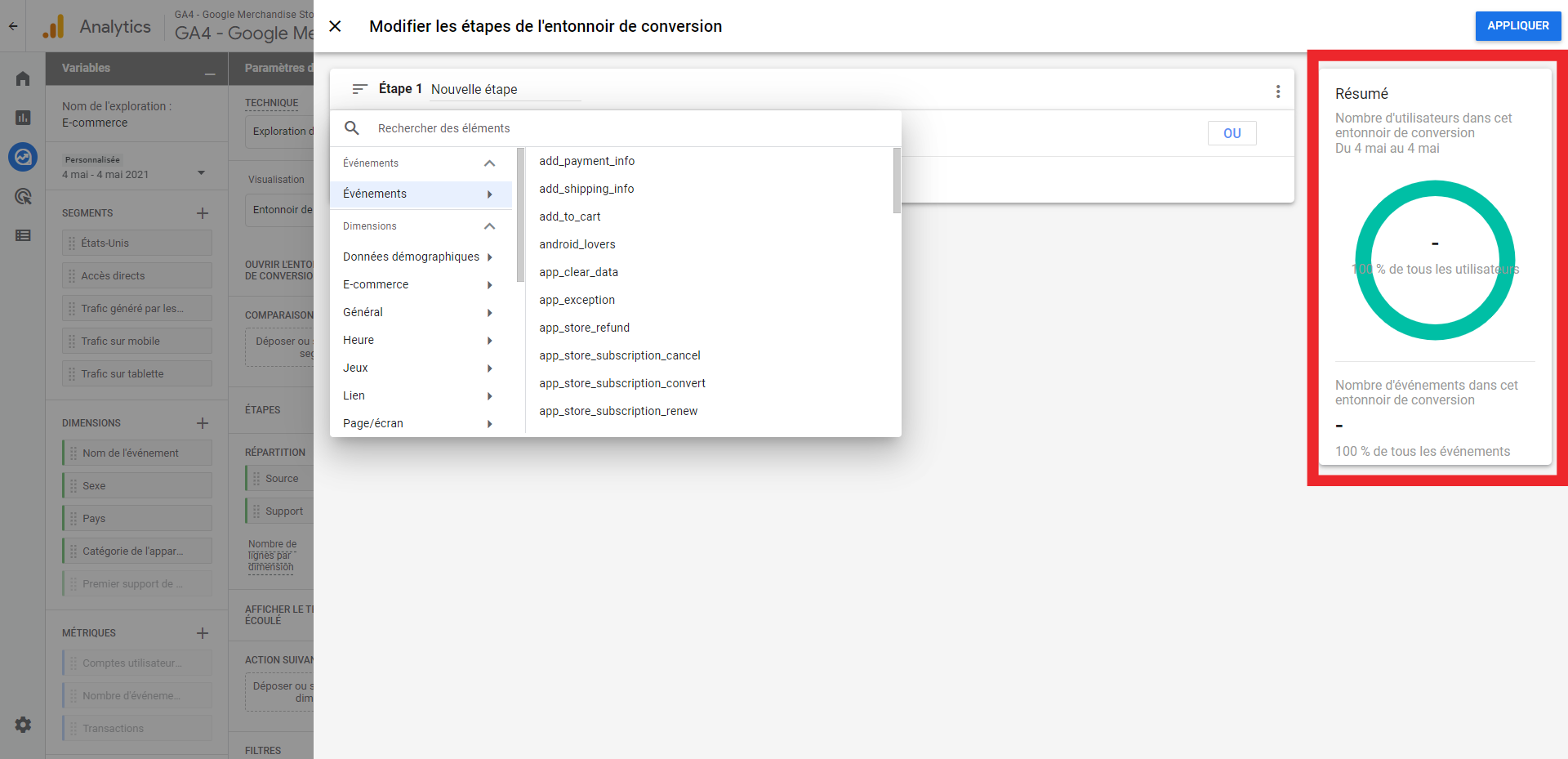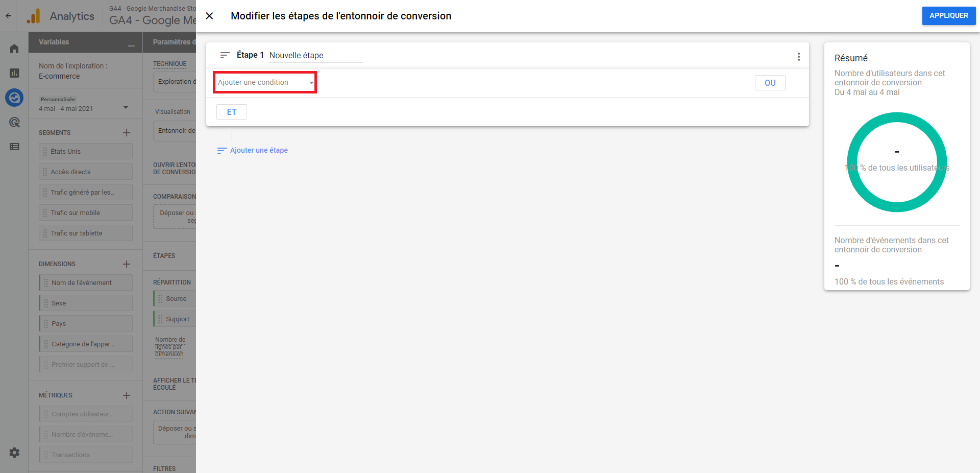 Vous pourrez directement voir sur la droite le nombre d’utilisateurs qui seront pris en compte dans l’entonnoir de conversion en fonction des différentes étapes.