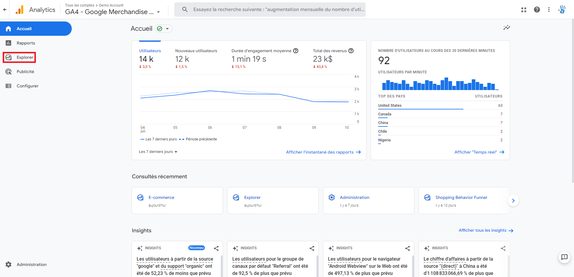 Étape 1 : accéder à la partie “Explorer” dans le menu à gauche de Google Analytics 4