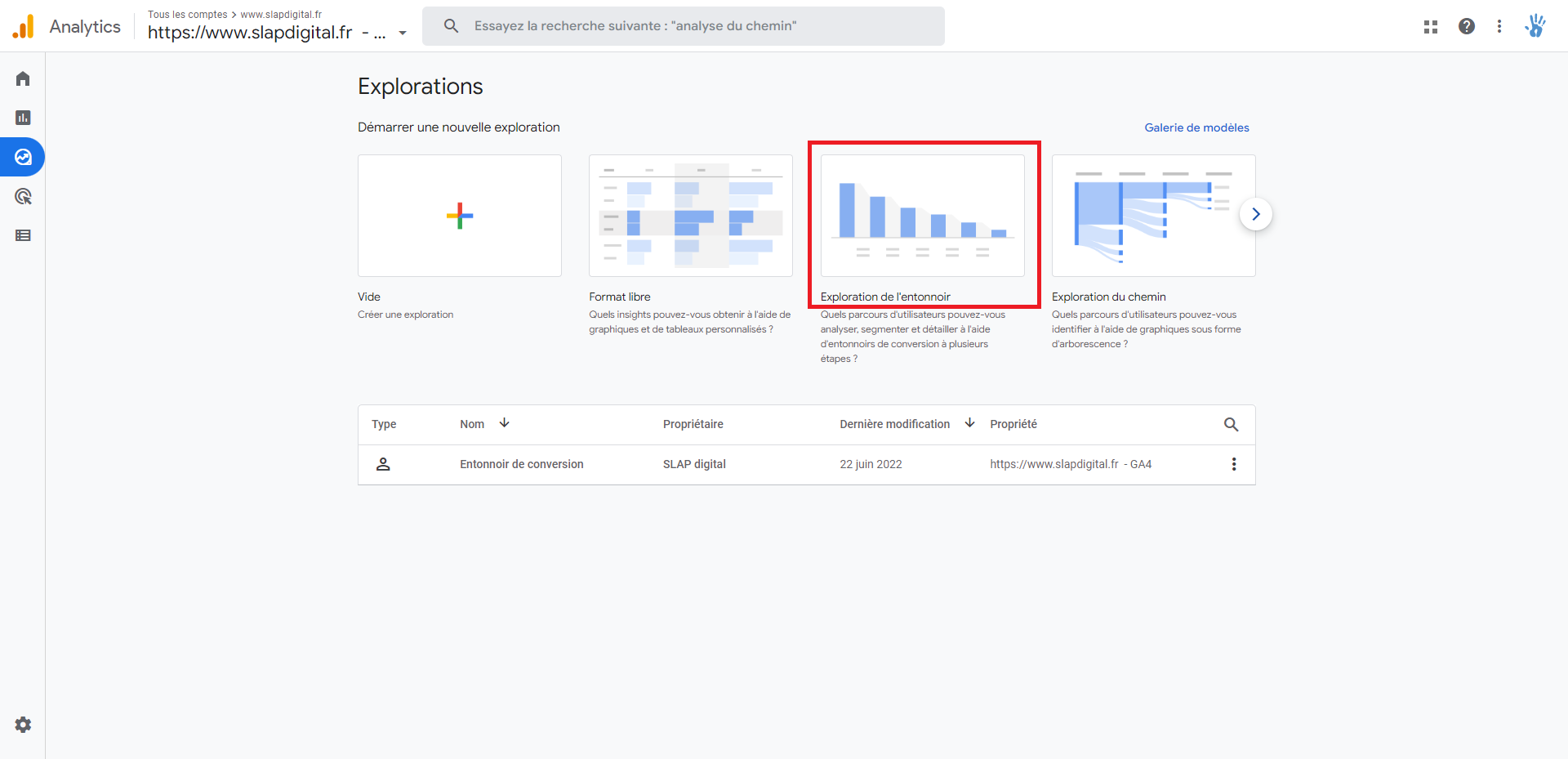 Étape 2 : Cliquer sur ‘Exploration de l’entonnoir”