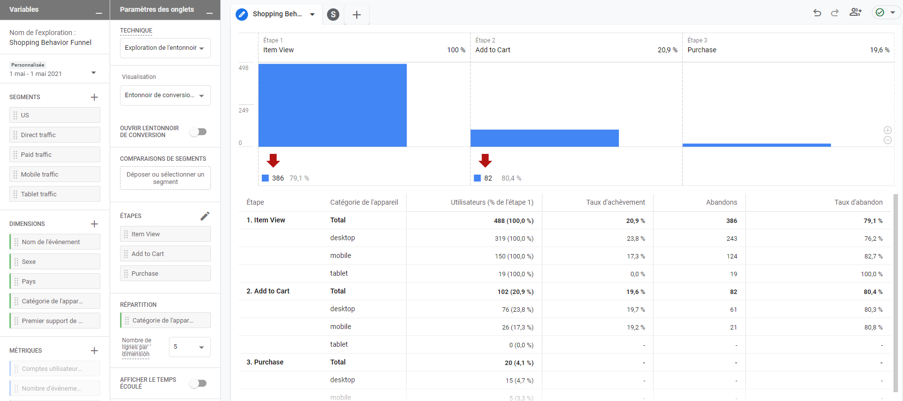 - Technique : c’est le type de rapport que vous allez créer. Ici l’entonnoir de conversion est appelé “Exploration de l’entonnoir”.